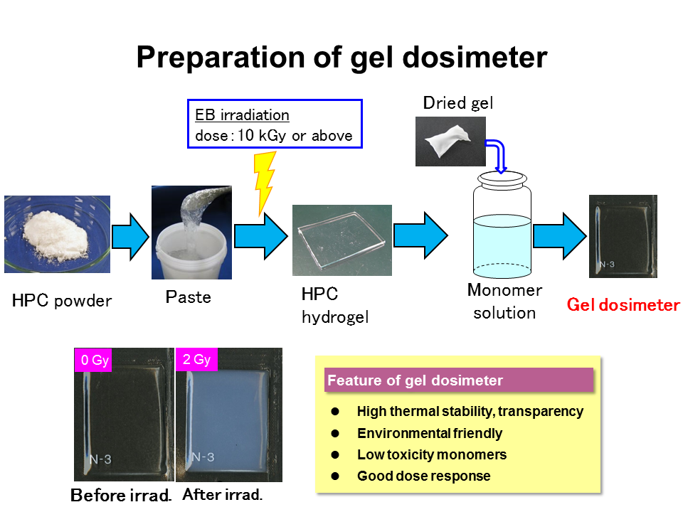 Approximately one in three Japanese have died of cancer, therefore development of cancer treatment technology is the most important issue. Radiation therapy can cure the cancer without cutting, so it maintains the form and function of our body even after healing. In a particular field of advanced radiation therapy, knowing exact spatial dose distribution in vivo is critically important. In our research project, tissue equivalent gel dosimeter is developed using radiation-crosslinked hydroxypropylcellulose (HPC) as a base material to evaluate three-dimensional dose distributions accurately. Polymer gel dosimeter is prepared by irradiating the HPC solution with electron beam to make radiation-crosslinked hydrogel, and immersed it in an aqueous solution of nonaethylene glycol dimethacrylate and 2-hydroxyethyl methacrylate. Although this is transparent gel before irradiation, it becomes cloudy enough to see in the irradiation of about 2 Gy which is an applied dose in radiation therapy. Degree of cloudiness (sensitivity) can be controlled by the composition of the detector reagent.