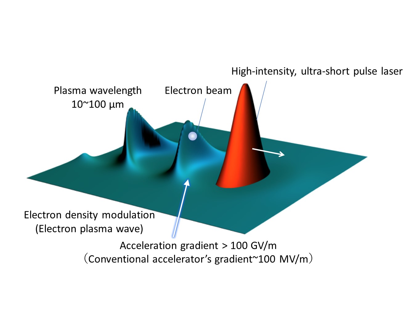 When a high-intensity laser pulse is injected into a gas, a plasma wave is generated to accelerate electrons. The resulting acceleration electric field is three orders of magnitude greater than that of conventional accelerators (microwave technology), enabling high energy electron acceleration over short distances.