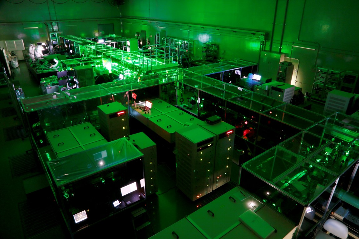 30Jのレーザーエネルギーを30 フェムト秒(1フェムトは1000兆分の1)の時間に閉じ込めることにより1000兆ワットの超高強度を実現します。(強力な励起レーザーの光で緑色に光っています。) - 装置写真