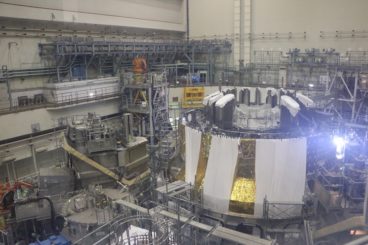 こちらが点検ブースからの景色。右半分の白いカバーと金色の断熱材に覆われたJT-60SAが一望できました。