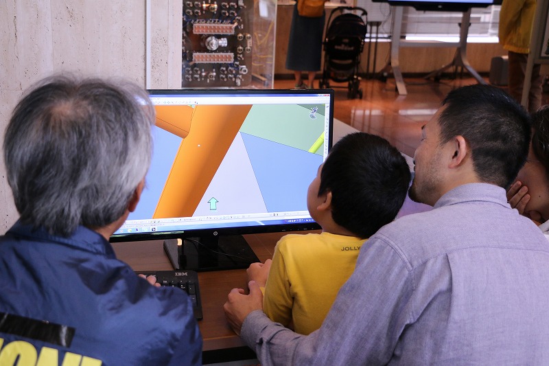 他にも制御棟では、圧電素子を使った「ミニ放電発生装置」でプラズマ制御に必要な放電現象の実験を行ったり、JT-60SAの設計に使った3D-CAD(図面データ)を閲覧したり、お子様にも楽しんでいただきました。