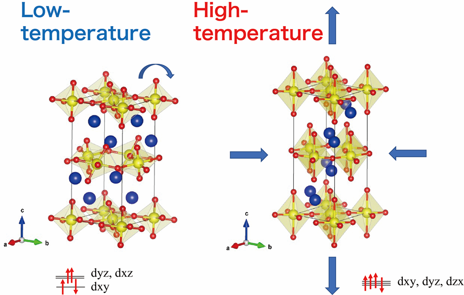 The team of researchers, which included Dr. Lei Hu from Tokyo Tech, analyzed reduced CRO and saw that it has a monoclinic crystal structure at low temperatures, which can be understood by three axes that form a rectangular prism with a parallelogram as its base. After experimental investigations and theoretical calculations, they saw that monoclinic CRO has distortions in its crystal structure known as Jahn-Teller distortions, and a rotation of the building block of CRO, a RuO6 octahedron. The monoclinic phase is contracted in one crystallographic direction (c-axis in Figure 1). The Jahn-Teller distortion refers to a geometric distortion of RuO6 that lowers the overall energy of the system. It is these distortions that are responsible for CRO’s unusual NTE behavior. The Jahn-Teller distortion is also associated with an orbital ordering in the electronic structure of the system.