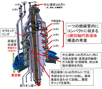 そこで、イーターNBIの負イオン加速器は、加速電極を5段に積み上げた静電加速方式とし、各段当たり20万ボルト、最大100万ボルトの電圧を印加し、エネルギー 100万電子ボルトの負イオンビームを生成します。高電圧を絶縁し、かつ、できるだけコンパクトにするために、従来は加速器を絶縁ガス中に設置する方式が用いられてきました。しかし、イーターではプラズマから発生する放射線により絶縁ガスが電離され電流が流れてしまうため、絶縁ガスを利用できないことから、図1に示すように加速器を真空中に設置することとしました。その反面、高気圧の絶縁ガスで絶縁された高電圧伝送管から、真空中に設置された加速器の間を電気的に接続し高電圧を供給する全く新しいブッシングが必要となりました。結果として、このブッシングには、