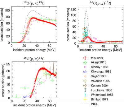 陽子線はエネルギーを失いながら石英ガラス中を進むため、その深度分布はエネルギー分布として捉えることができます。実験データから導出した核反応断面積を図4に示します。図4には比較として米国立核データセンター(NNDC)に収録されている過去の測定値と、INCLと呼ばれる最新の原子核コードを用いたモデル計算の結果が載せてあります。本手法では一度の測定で非常に多くのデータを取得することが可能であり、過去の測定値に比べてばらつきや誤差が小さいことがわかります。また、原子核モデルを用いた計算結果は実験で得られる値から大きく外れてしまうことが分かります。