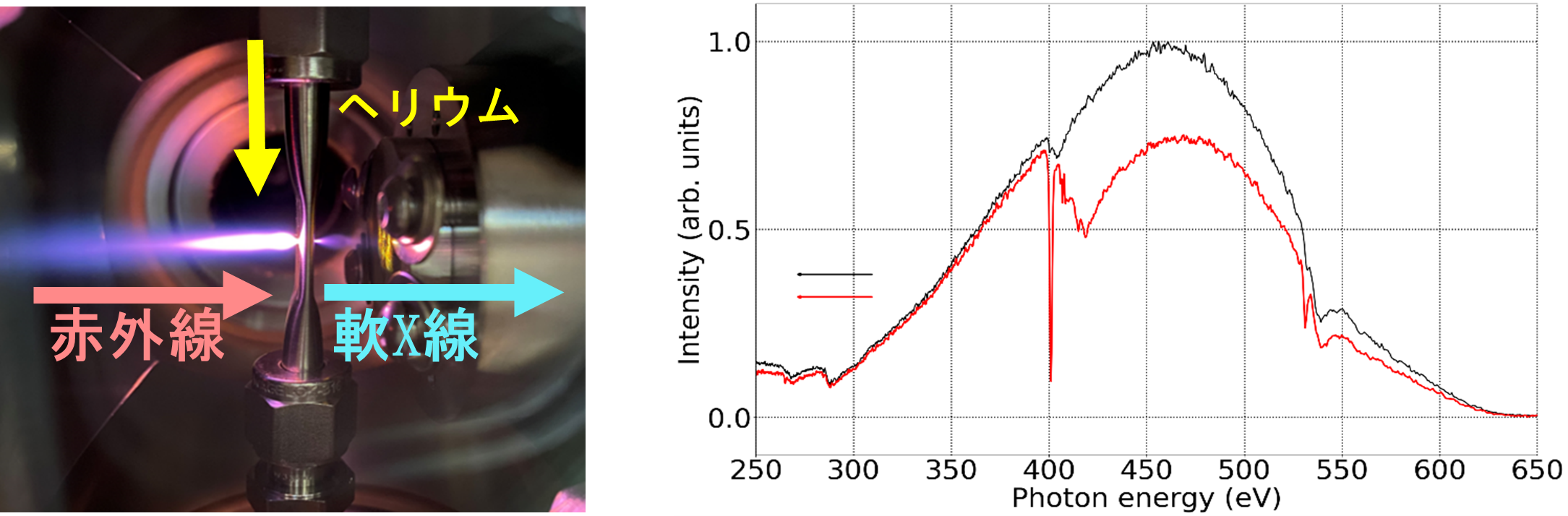 図1:極短パルス・軟X線発生の様子(左図)とそのスペクトル(右図、黒線)、および空気を透過させたスペクトル(右図、赤線)。窒素と酸素に固有な鋭い吸収が400 eVと540 eV近傍で同時に計測されました。