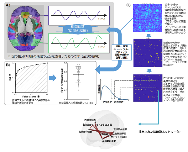 C)ポジティブ情動記憶の成績に関連する脳機能ネットワークを抽出:A)で算出した各自の各領域間の脳活動の同期の程度(105×105の組み合わせ)とB)で算出した各自のポジティブ情動記憶の成績の関連の強さを計算します。この際,年齢,性別,ニュートラル・ネガティブ情動記憶の成績といったポジティブ情動記憶に関連のない要因は排除して,両者の関連の強さを算出します。このような過程を経て抽出されたネットワークが図最下部の脳機能ネットワークです。