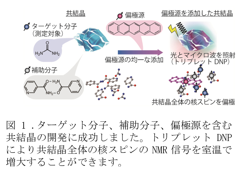 - 寒剤が不要な室温でスピンの向きを揃えることができるトリプレットDNP※4)に注目し、トリプレットDNPの適用できる分子の種類を増やす共結晶※5)化技術を開発しました。MRI分子プローブ※6)である尿素を含む複数分子のトリプレットDNPを室温で実現しました。