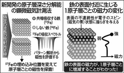この手法を用いて、鉄の表面第1層目から2層目、3層目と順に調べたところ、鉄の磁力が表面から1原子層ごとに強弱することを見いだした。1層目の磁力は強く、2層目は弱い。3層目はやや強く、4層目はやや弱くなる。そして、7層目になると、よく知られている内部の磁力と同じになるのだ。この結果、人類が鉄を利用して数千年以上の時を経て、初めて鉄表面の磁気構造が明らかとなった。