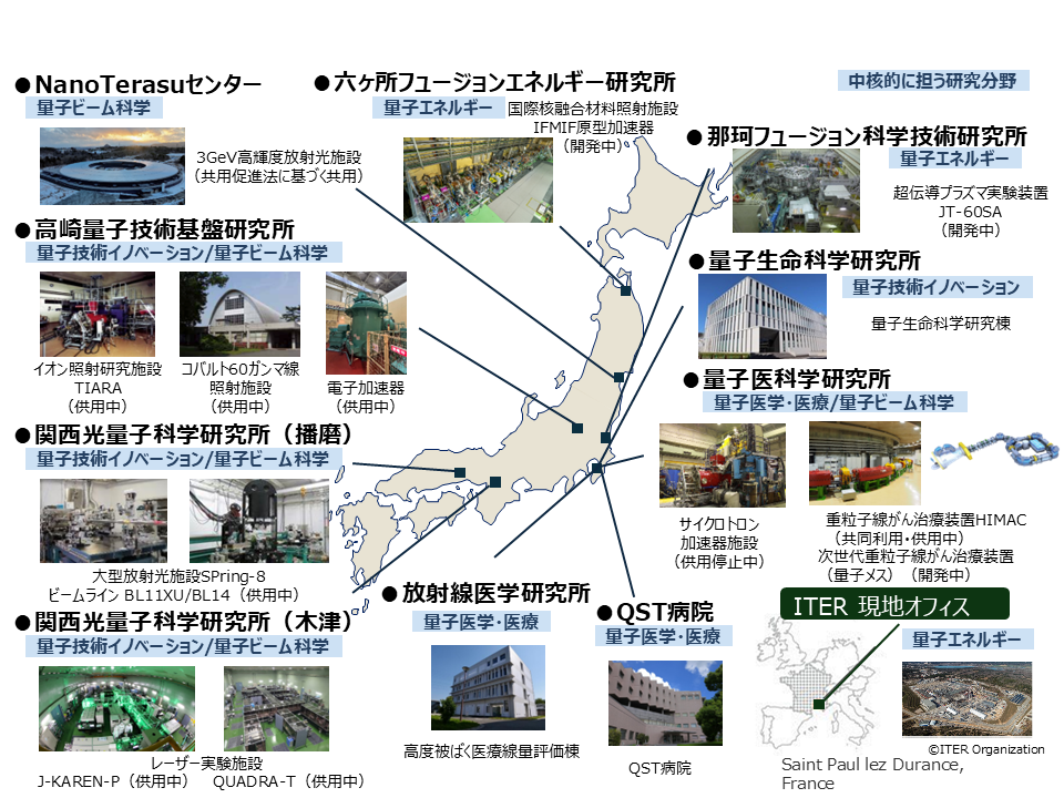 - 国の指定を受けた量子技術基盤拠点、量子生命拠点、フュージョンテクノロジー・イノベーション拠点、基幹高度被ばく医療支援センター、3GeV高輝度放射光施設等の研究開発拠点では、国の量子科学技術基盤の中核として人材、知財、施設を強化します。